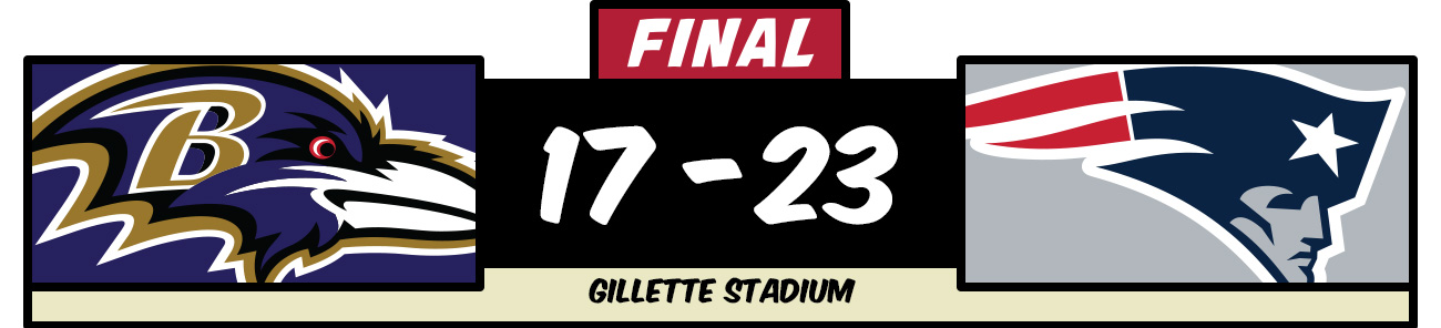 La victoria por 23-17 mantiene a los Patriots (4-5) en el tercer lugar de la AFC East y deja a los Ravens (6-3) en segundo lugar (junto a los Browns) de la AFC North.