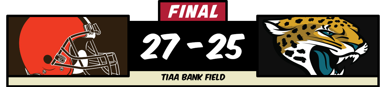 Los Cleveland Browns alcanzaron ocho victorias por primera vez desde 2007, aunque sufrieron hasta el último el equipo fue capaz de asegurar el juego ante unos Jaguars que con Mike Glennon como quarterback, que dieron una buena batalla pero que se quedaron cortos ante el juego terrestre de Cleveland y Nick Chubb volviendo a su papel habitual de gran estrella.