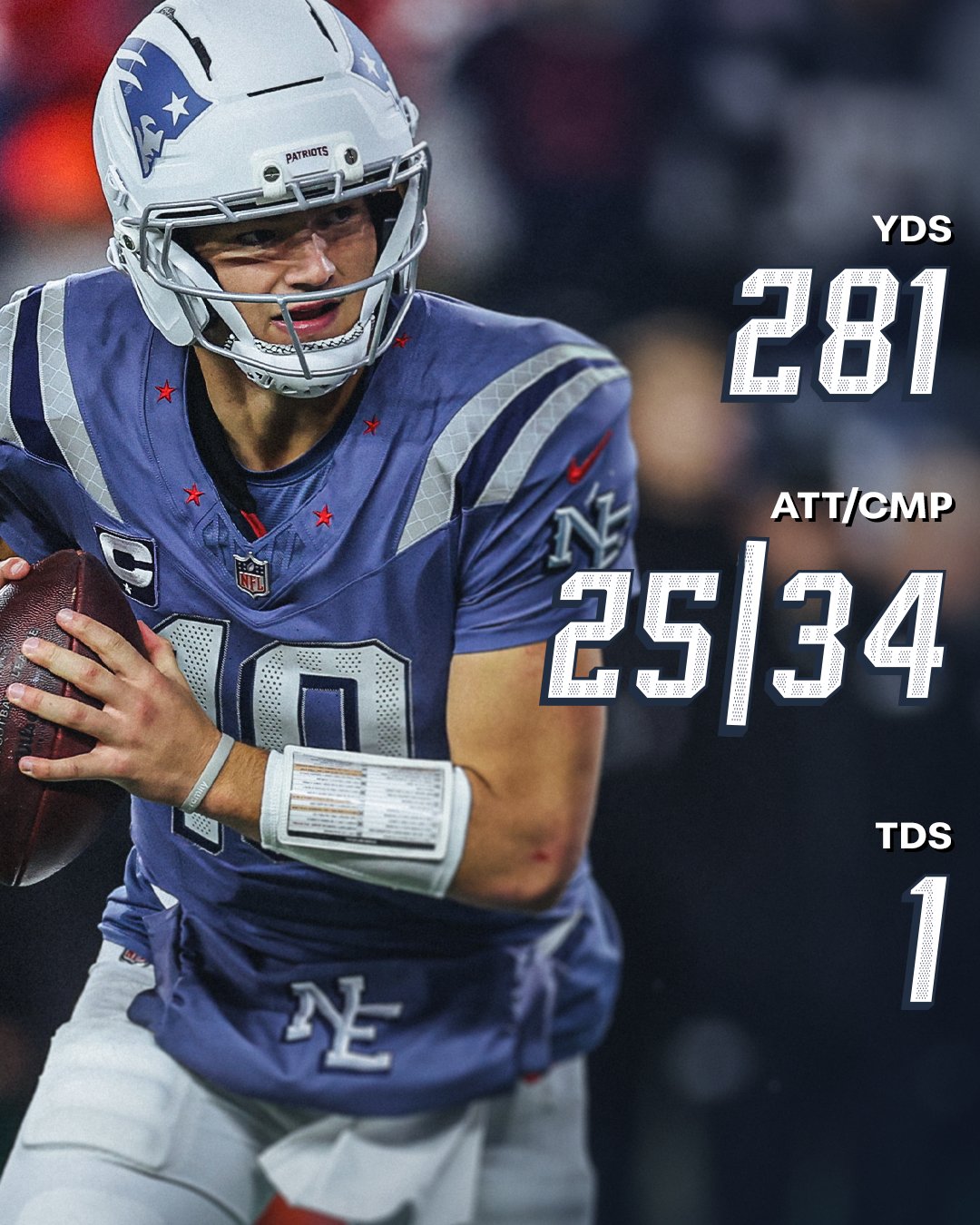 A pesar de la derrota ante los Jets, Maye firmó una actuación madura y eficiente. Completó 25 de 34 pases para 281 yardas, con 1 TD, 0 intercepciones y un sólido rating de 107.6.